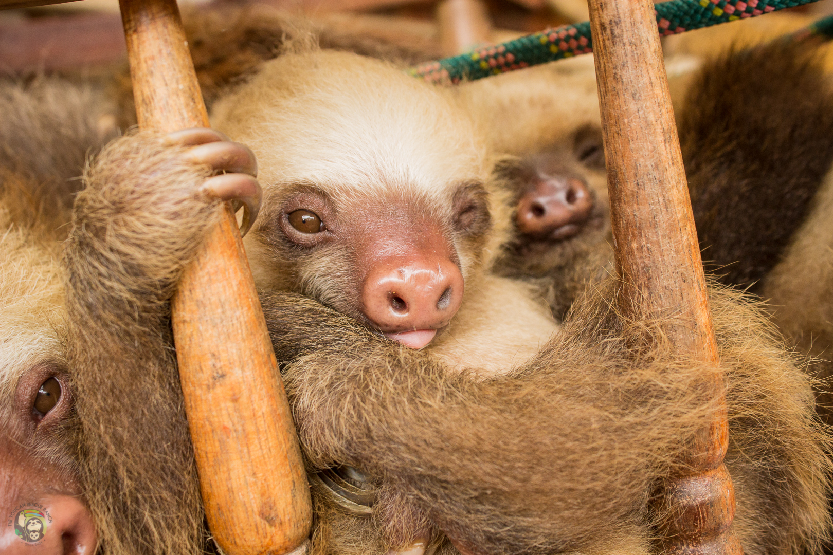 The only girl of the high school kids, Chispa (and definitely not Cheese Puff, as some people have confused her name for) sticks out among the babies with her… tongue, which can often be seen poking out of her ever-so-slightly agape mouth. Perhaps Chispa’s most noticeable facial feature, however, is her left eye, which is almost completely shut. After her mother fell out of a tree and landed on concrete, Chispa sustained a blinding eye injury. Despite this handicap, Chispa is one of the most independent sloths of the bunch. As a silent underdog of sorts, Chispa often picks off food that the other babies are yet to notice, and has occasionally been seen sleeping alone hanging upside down a lá wild sloth. Chispa has also gotten into her share of precarious situations. One day, Chispa was found clinging onto a light fixture high up on the ceiling of Leslie’s porch all by her lonesome. It’s likely that she climbed from the safety of the sloth rocking chairs and made her way up to the ceiling using a variety of objects (ropes stretching across the porch, a broom leaning against a pillar, low hanging cables, etc.). This goes to show that despite whatever handicap an animal patient at the Ranch may have, they still have a chance at release into the wild, and Chispa has proven to be no exception. There is also the slim possibility that Chispa is secretly capable of teleportation, though this is yet to be witnessed firsthand.